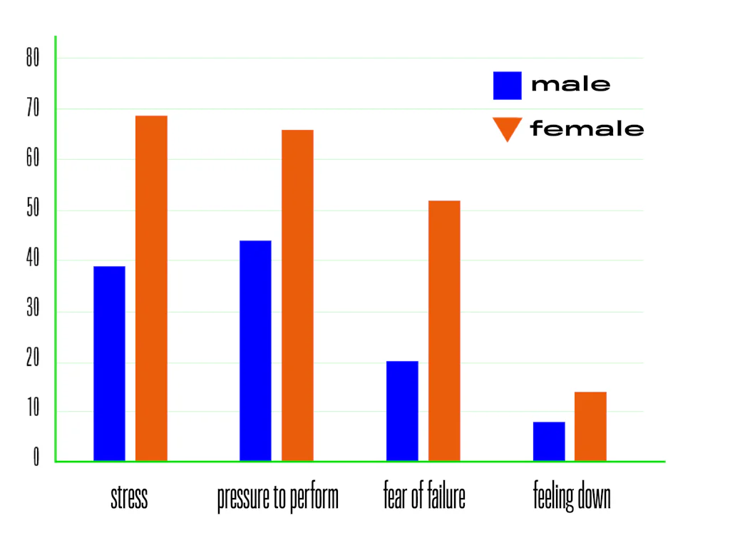 Thirdly, it’s evident that many students are grappling with stress and mental health issues. On average, 55% of Antwerp students experience stress, performance pressure, or anxiety, but there are clear gender differences. Women are generally more vulnerable to these issues than men. Also, the factors causing stress differ between genders; for men, it’s more about school-related stress, while for women, it encompasses various stressors. However, seeking help is not very common proportionally.